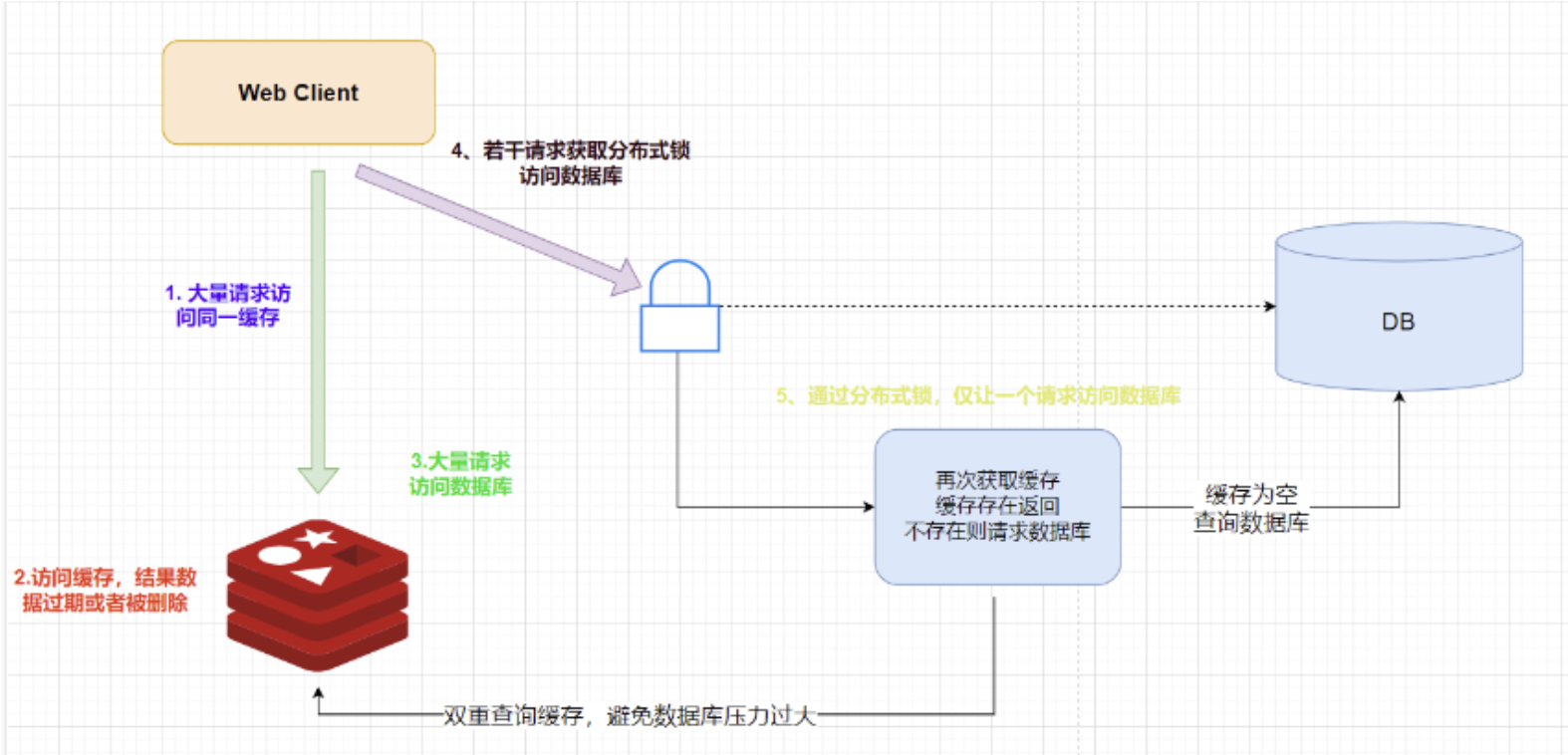- 获取锁:在查询数据库之前,先尝试获取一个分布式锁,只有一个线程可以成功获取锁,其他线程等待。