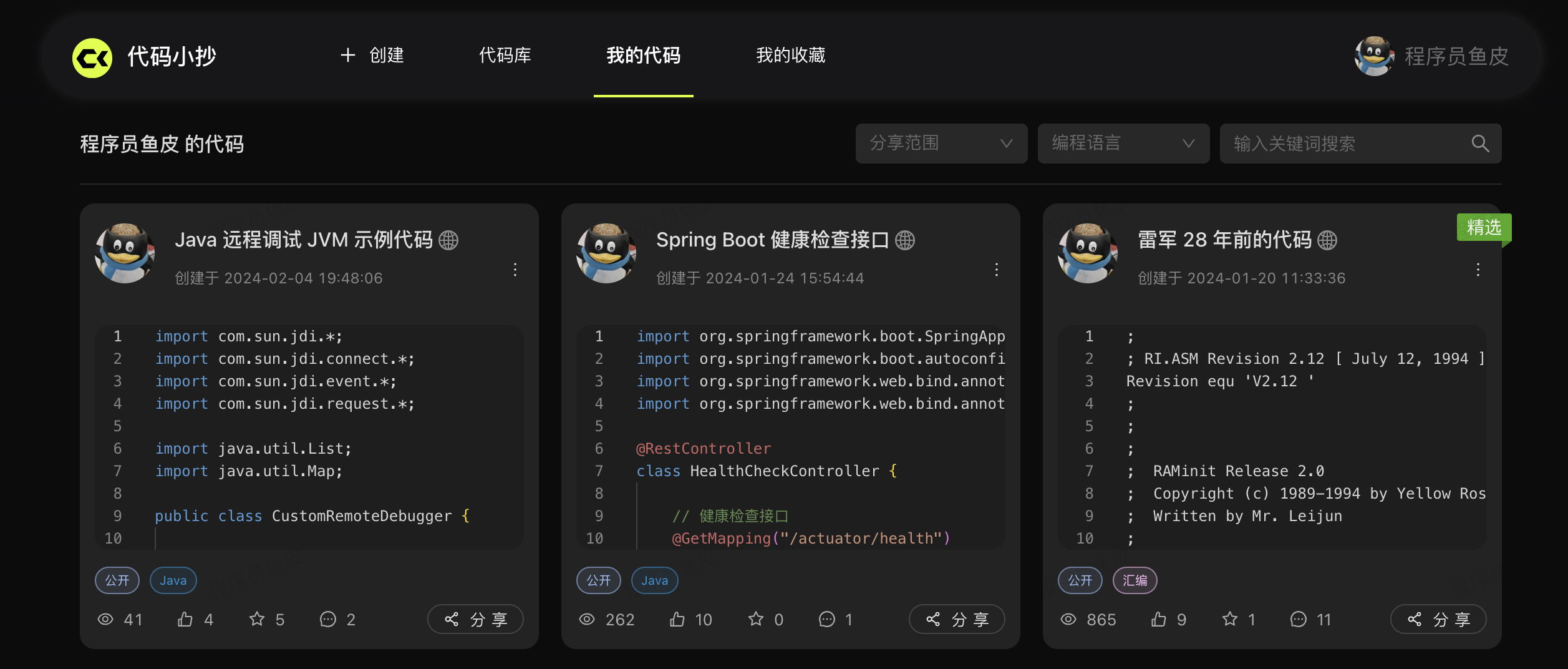 大家好,我是程序员鱼皮。分享下我们团队新开发的小项目 代码小抄,简单易用的代码分享工具。