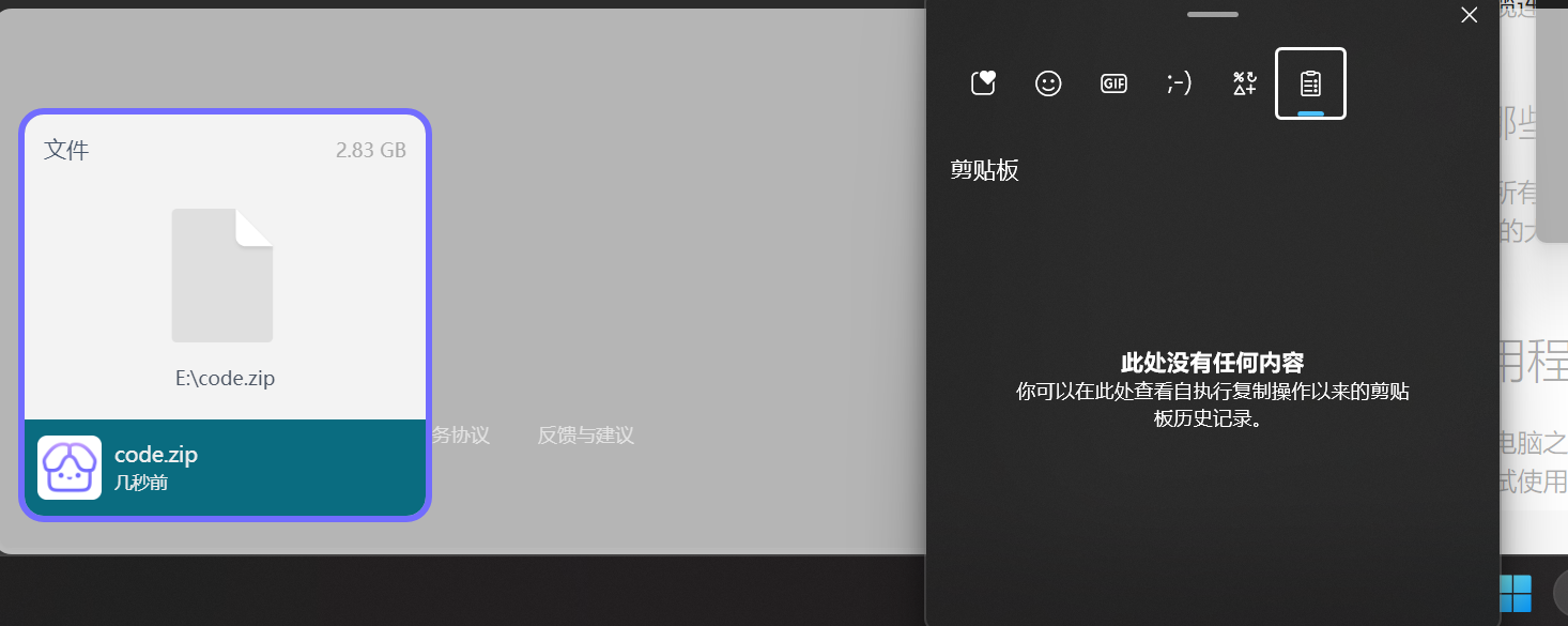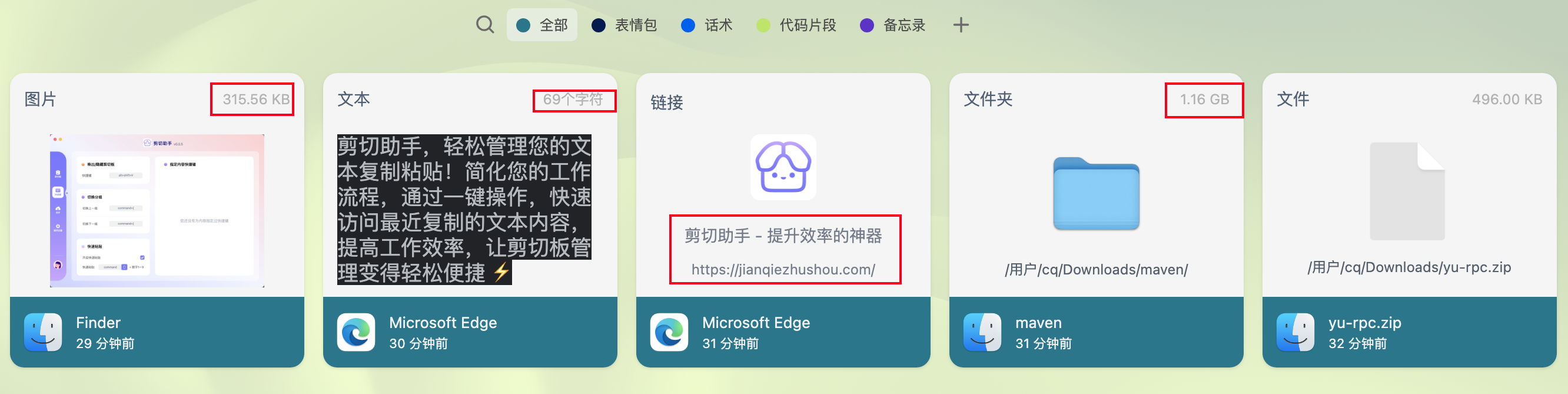如果复制的是图片和文件,会展示占用的空间大小;复制的是文本,将展示字数等。