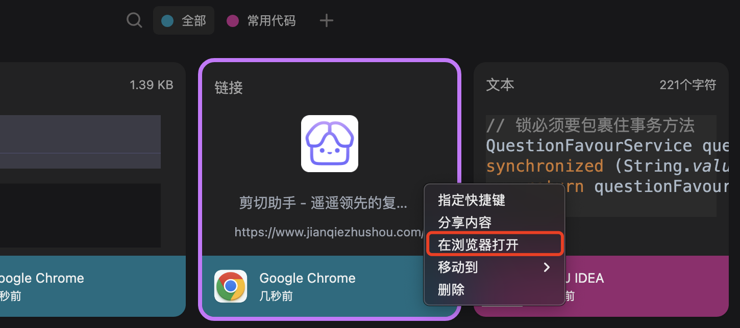 如果复制的内容是链接,会展示网页标题和 logo,并且右键单击就能直接在浏览器中打开: